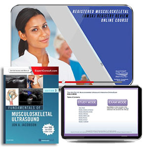 The package includes the comprehensive Fundamentals of Musculoskeletal Ultrasound softcover book, the MSK Ultrasound Interactive Registry Review Online Mock Exam, and 12 months unlimited access to the Registered Musculoskeletal Registry Review online course!
